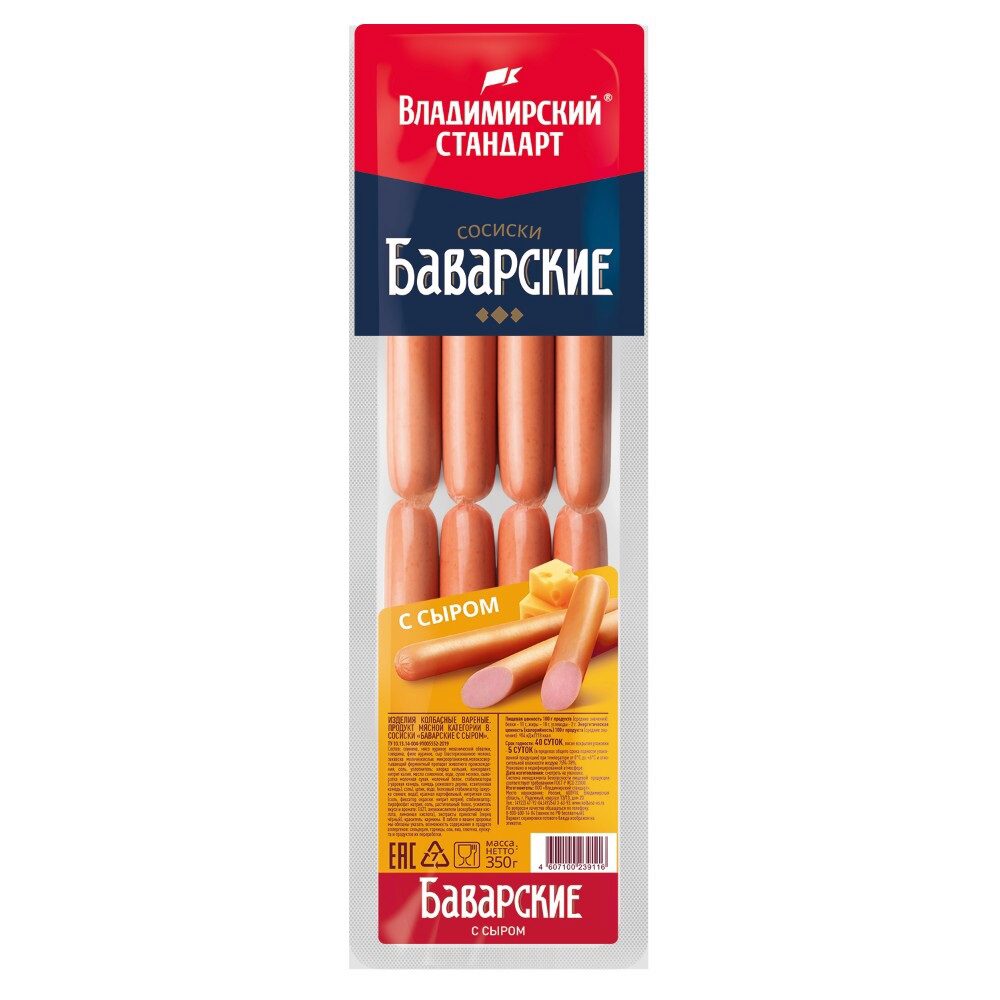 Сосиски Баварские с сыром от Владимирский Стандарт — это сочное и нежное угощение для всей семьи. Они изготовлены из отборного говяжьего и свиного фарша, внутри которых скрываются кусочки плавленого сыра, тающие во рту и придающие продукту пикантный сливочный вкус. Сосиски имеют аппетитную золотистую корочку после непродолжительной варки или обжаривания. Они станут главным ингредиентом сытного завтрака, основой для хот-догов или вкусным дополнением к гарниру на ужин. Упаковка в защитной газовой среде гарантирует, что сосиски доходят до вас в идеально свежем состоянии, сохраняя свой вкус и сочность.