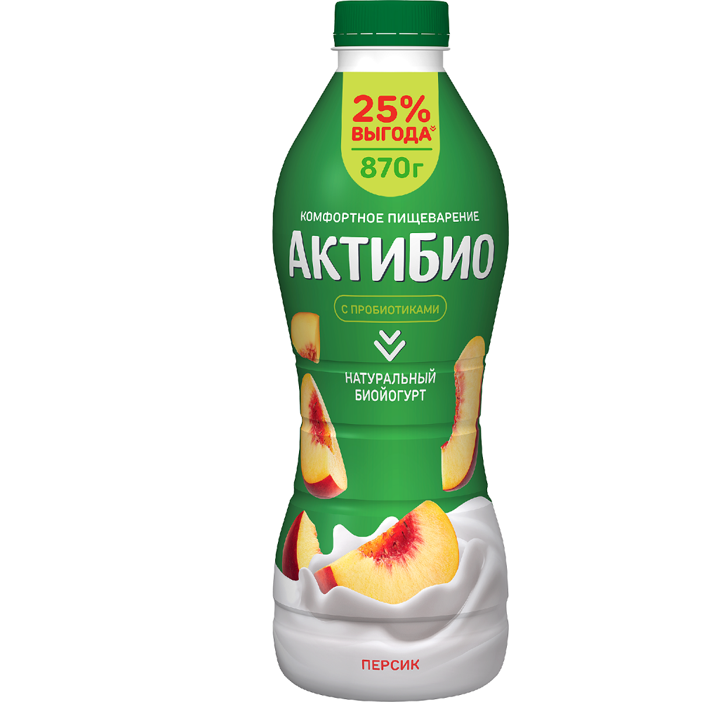 Биойогурт «АктиБио» с персиком обогащен пробиотиками и имеет жирность 1,5%. Он обладает нежной, однородной консистенцией и сбалансированным сладким вкусом с кусочками фруктов. Йогурт способствует улучшению пищеварения и укреплению иммунитета. Большая бутылка объемом 870 грамм удобна для семейного употребления. Это готовый полезный завтрак или перекус, который понравится и детям, и взрослым.