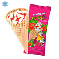 молоко цельное сгущенное с сахаром, масло сливочное, молоко сухое обезжиренное, вода питьевая, сахар, джем (сахар, патока крахмальная кукурузная, концентрированный сок клубники, загуститель – пектин), глазурь (растительные жиры, сахар, какао – порошок, эмульгатор – лецитин), стабилизатор (каррагинан, камеди гуарового и рожкового дерева), ароматизатор – ванилин; рожка: мука пшеничная, хлебопекарная в.с, сахар, крахмал картофельный, масло растительное, эмульгатор лецитин, ароматизатор – ванилин